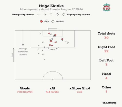 他的数据令人印象深刻。在为利物浦首发的前10场英超比赛中,只有丹尼尔-斯图里奇(8球)的进球数超过了埃基蒂克的7球。萨拉赫同样打进7球,略高于罗比-福勒和马内(均为6球)。这是一个相当显赫的群体。