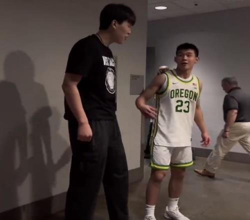 杨瀚森来到了现场观战,为俄勒冈大学出战的老乡林葳助威。